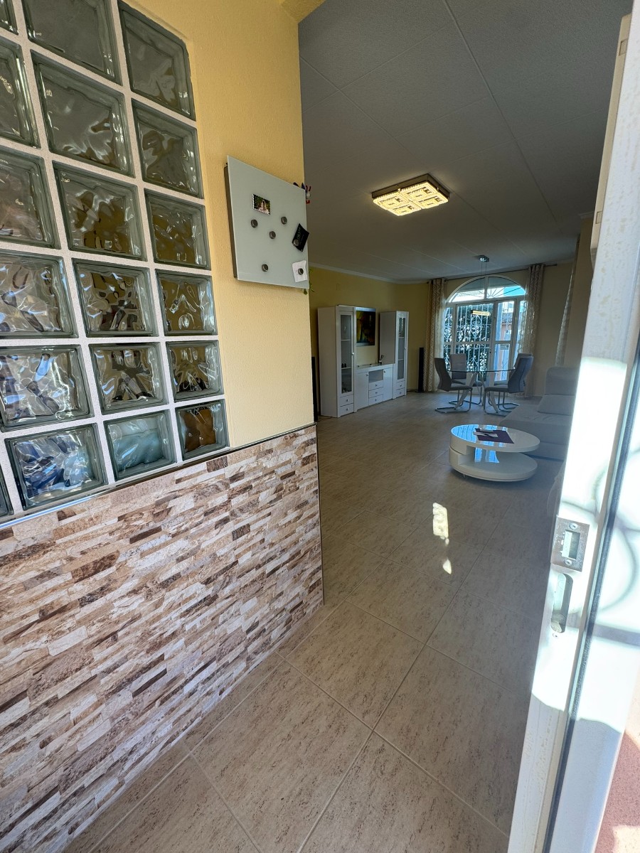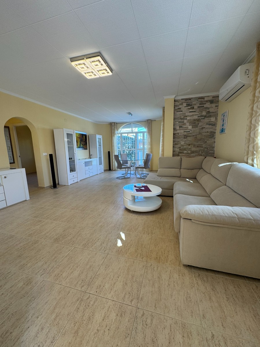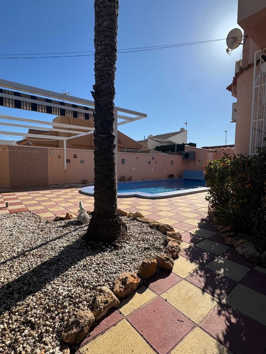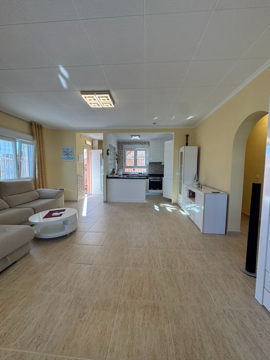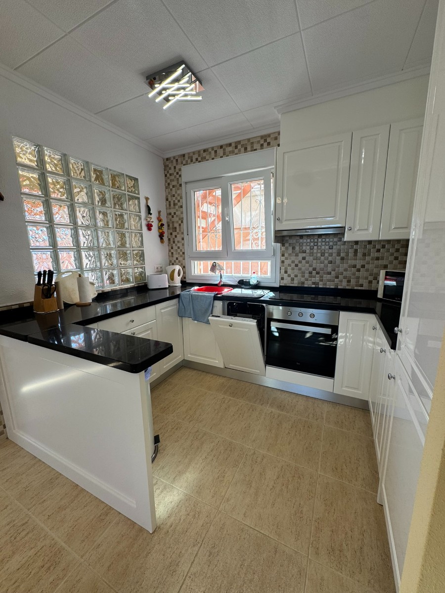 A unique villa located in a very quiet street in Las Mil Palmeras. This villa has a large plot with a 8x4 swimming pool whihch is heated and a large villa that has been converted into 2 separate living areas. The ground floor has 2 bedrooms, 1 bathroom and an american style kitchen & the top floor is a self contained 1 bedroom apartment with its own kitchen, lounge and bathroom. The lounge has access to a large balcony. The property could be converted with internal steps to make one large villa or you could keep the layout for possible rentals. Mil Palmeras is a beautiful beach side urbanisation with lots of bars, restaurants, supermarkets, doctors, pharmacy and some of the best beaches in the South Costa Blanca. Once you are here you do not need a vehicle as everything is within walking distance.