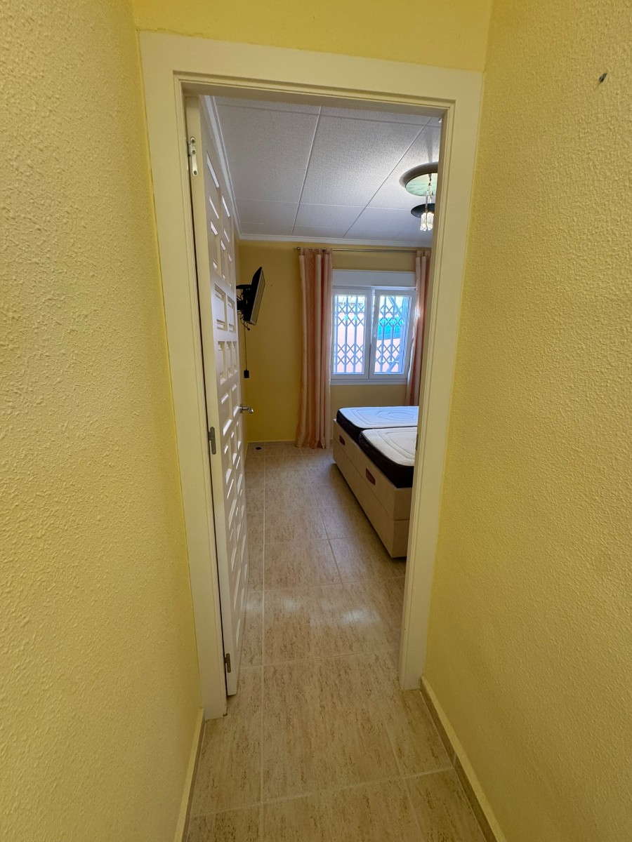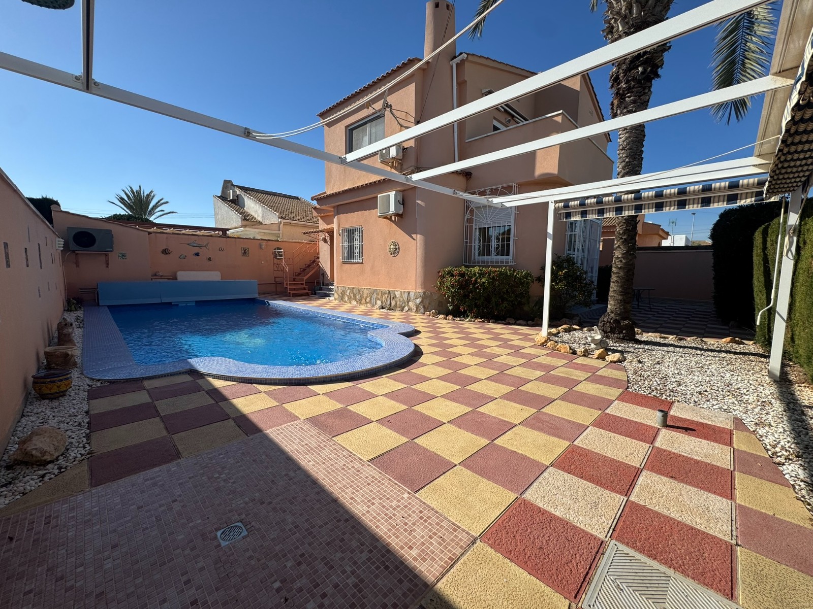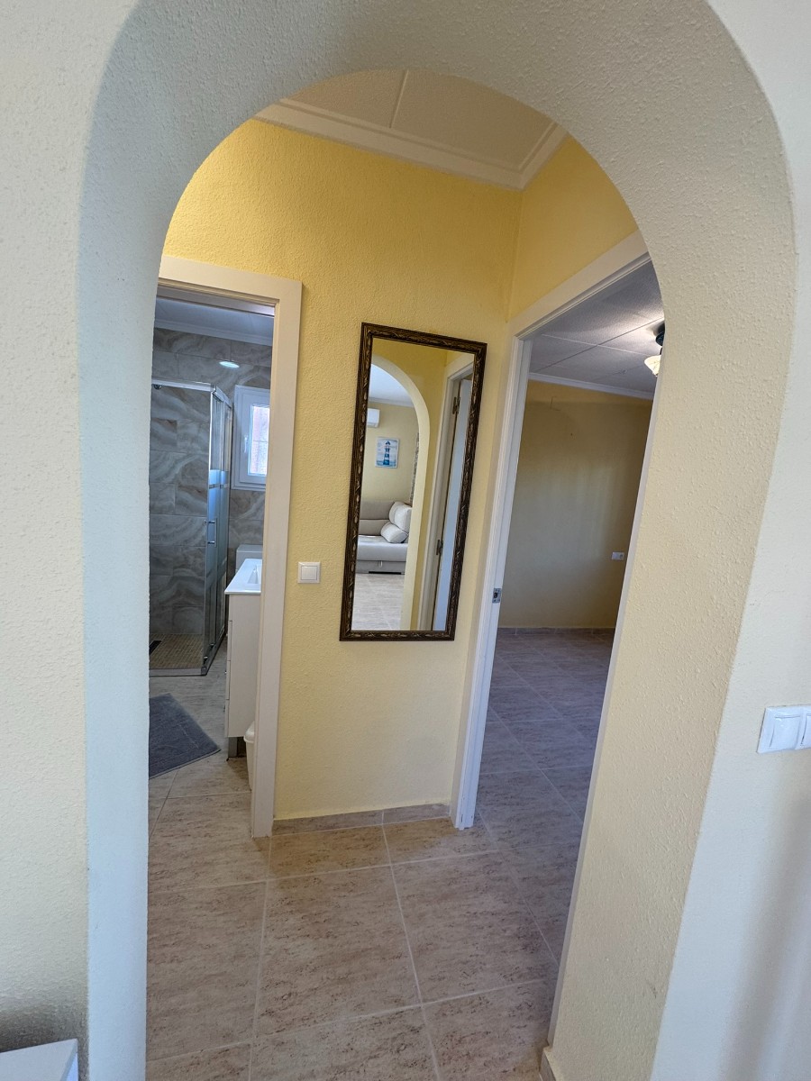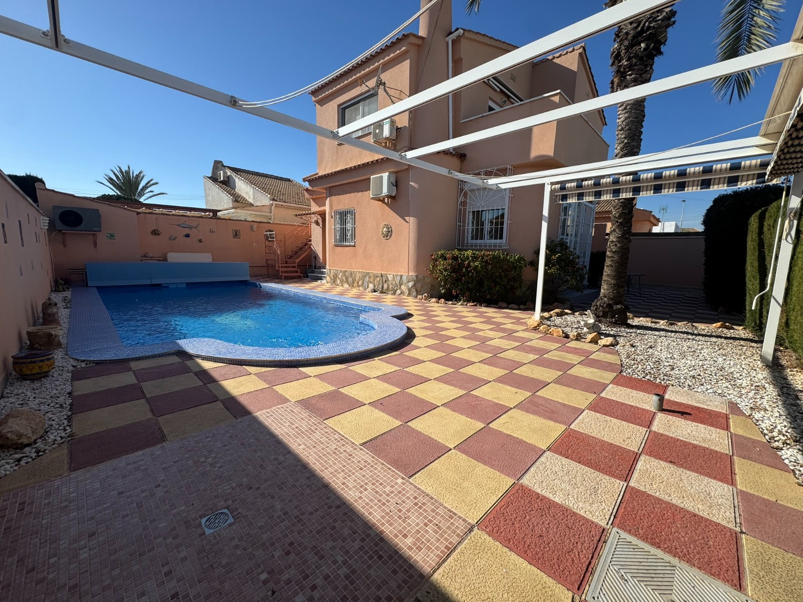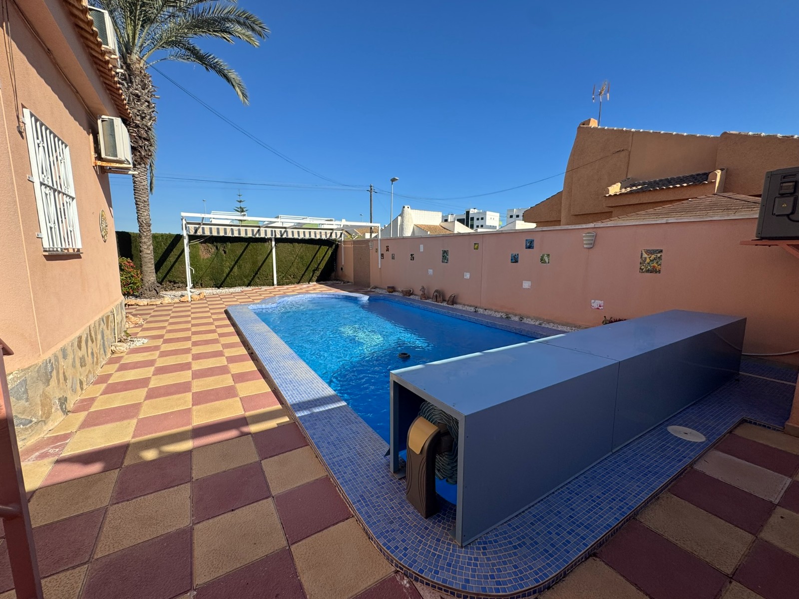 A unique villa located in a very quiet street in Las Mil Palmeras. This villa has a large plot with a 8x4 swimming pool whihch is heated and a large villa that has been converted into 2 separate living areas. The ground floor has 2 bedrooms, 1 bathroom and an american style kitchen & the top floor is a self contained 1 bedroom apartment with its own kitchen, lounge and bathroom. The lounge has access to a large balcony. The property could be converted with internal steps to make one large villa or you could keep the layout for possible rentals. Mil Palmeras is a beautiful beach side urbanisation with lots of bars, restaurants, supermarkets, doctors, pharmacy and some of the best beaches in the South Costa Blanca. Once you are here you do not need a vehicle as everything is within walking distance.