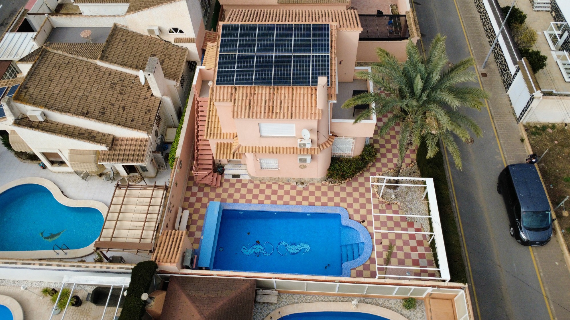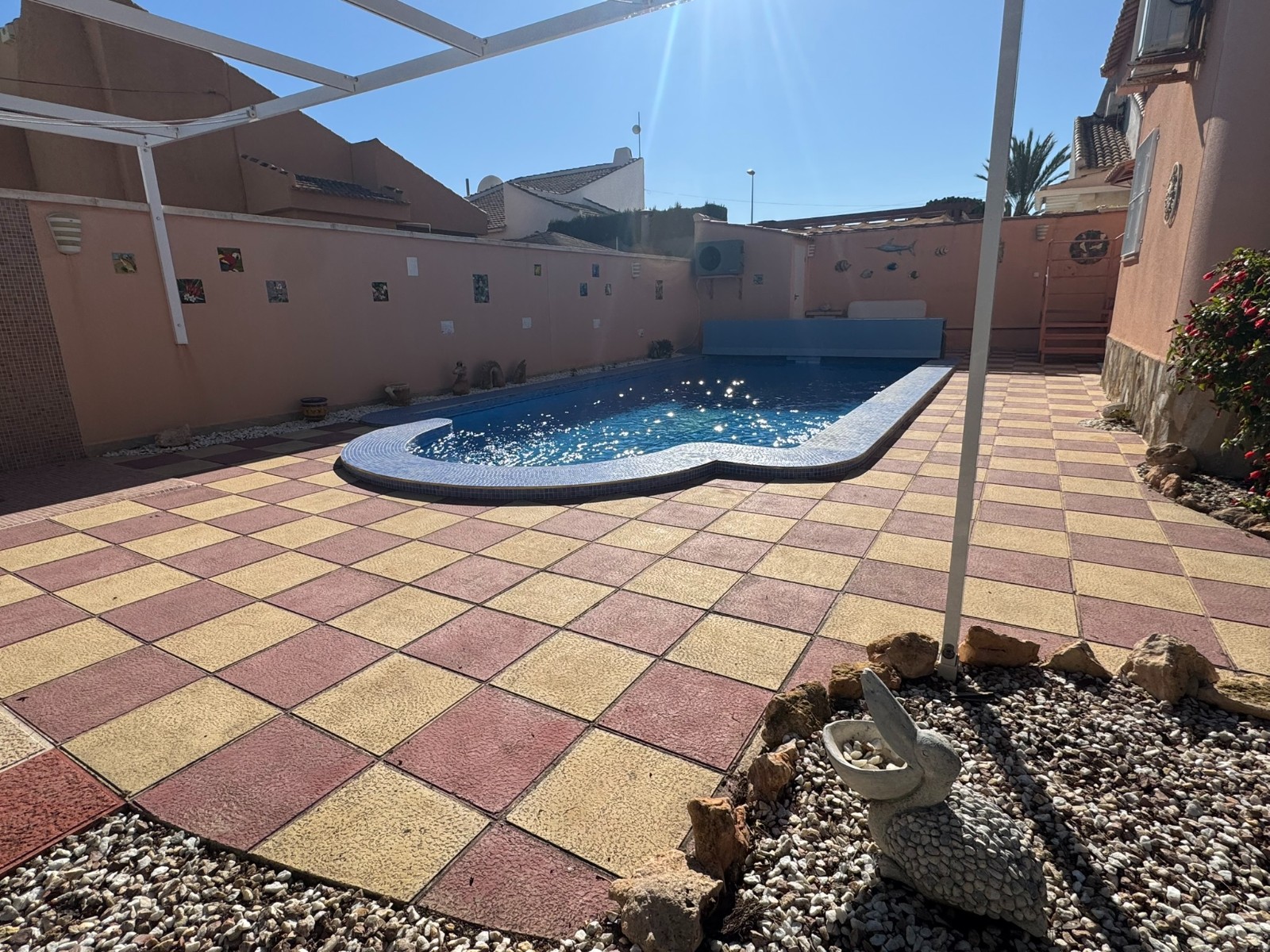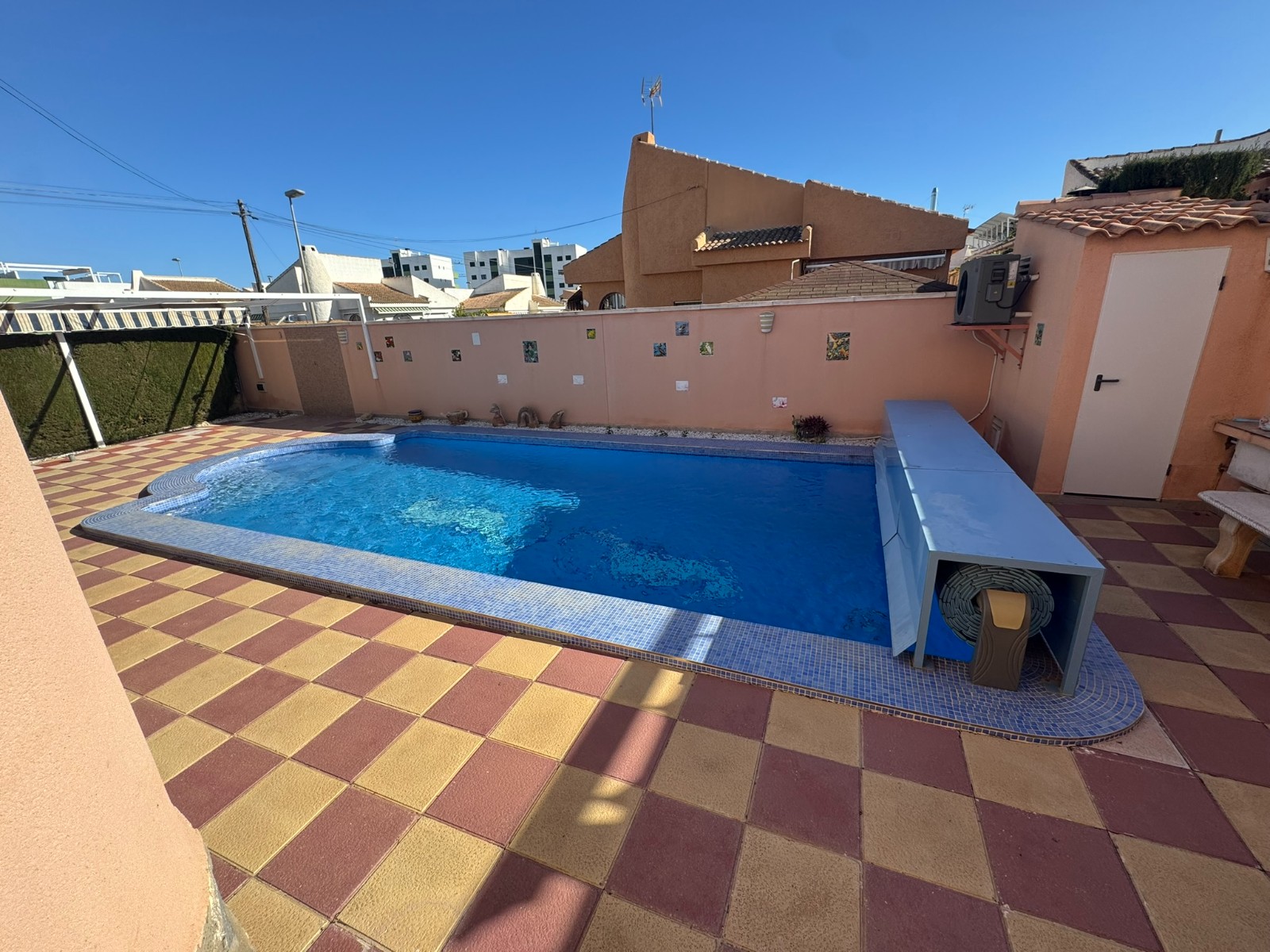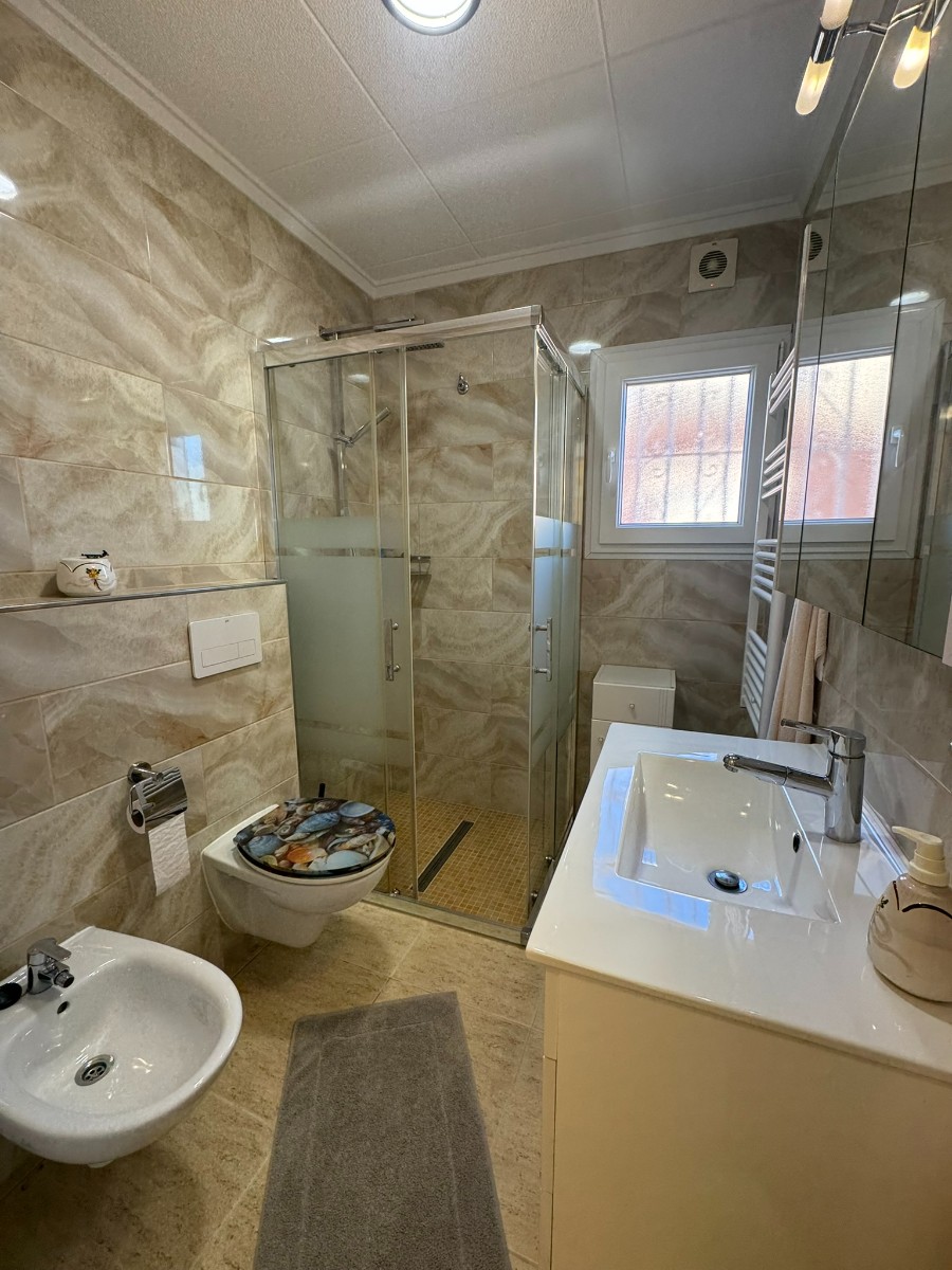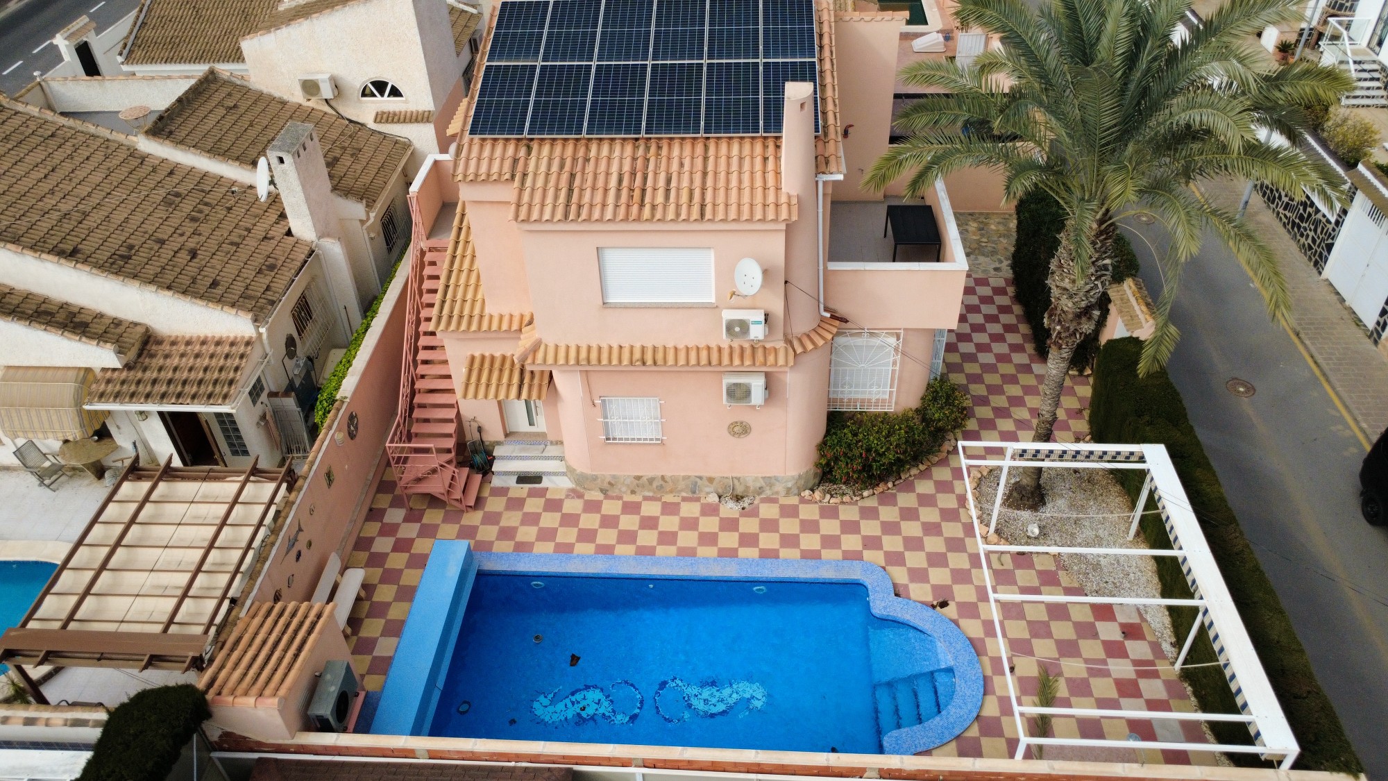 A unique villa located in a very quiet street in Las Mil Palmeras. This villa has a large plot with a 8x4 swimming pool whihch is heated and a large villa that has been converted into 2 separate living areas. The ground floor has 2 bedrooms, 1 bathroom and an american style kitchen & the top floor is a self contained 1 bedroom apartment with its own kitchen, lounge and bathroom. The lounge has access to a large balcony. The property could be converted with internal steps to make one large villa or you could keep the layout for possible rentals. Mil Palmeras is a beautiful beach side urbanisation with lots of bars, restaurants, supermarkets, doctors, pharmacy and some of the best beaches in the South Costa Blanca. Once you are here you do not need a vehicle as everything is within walking distance.