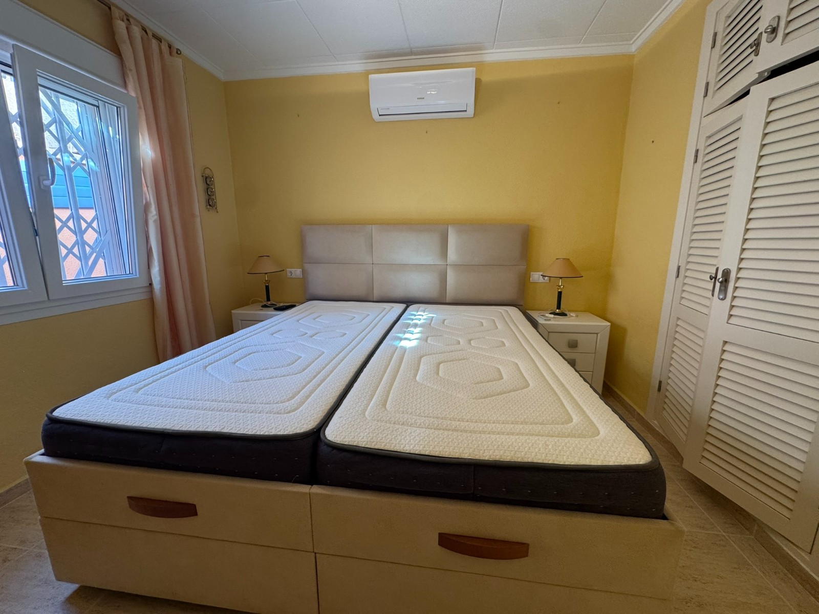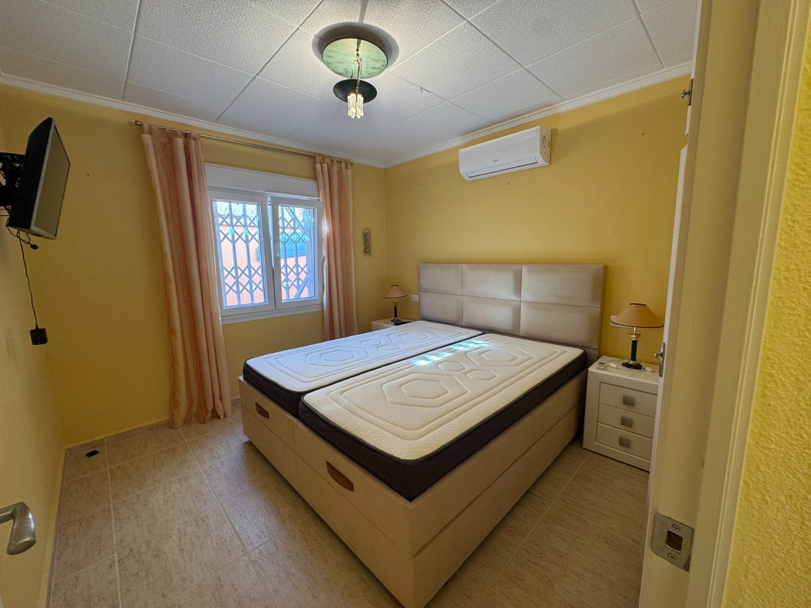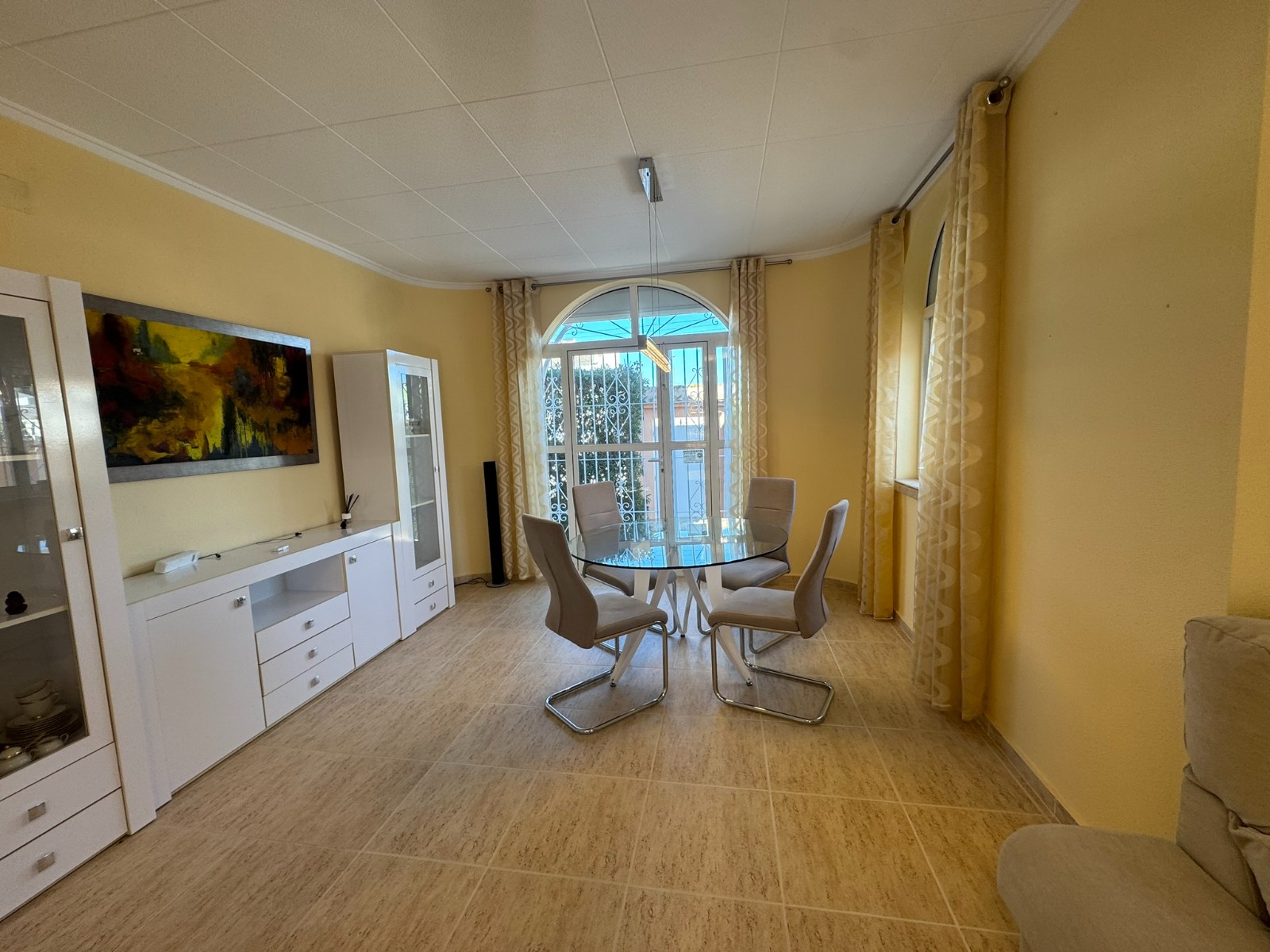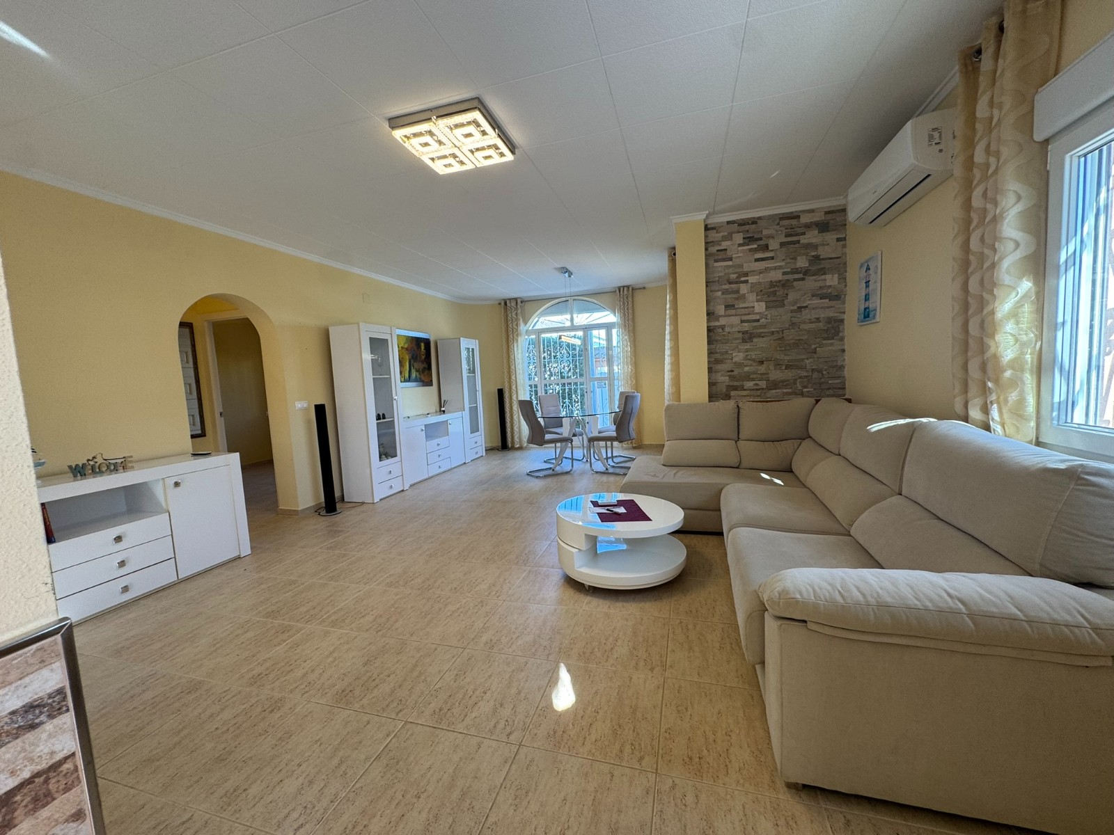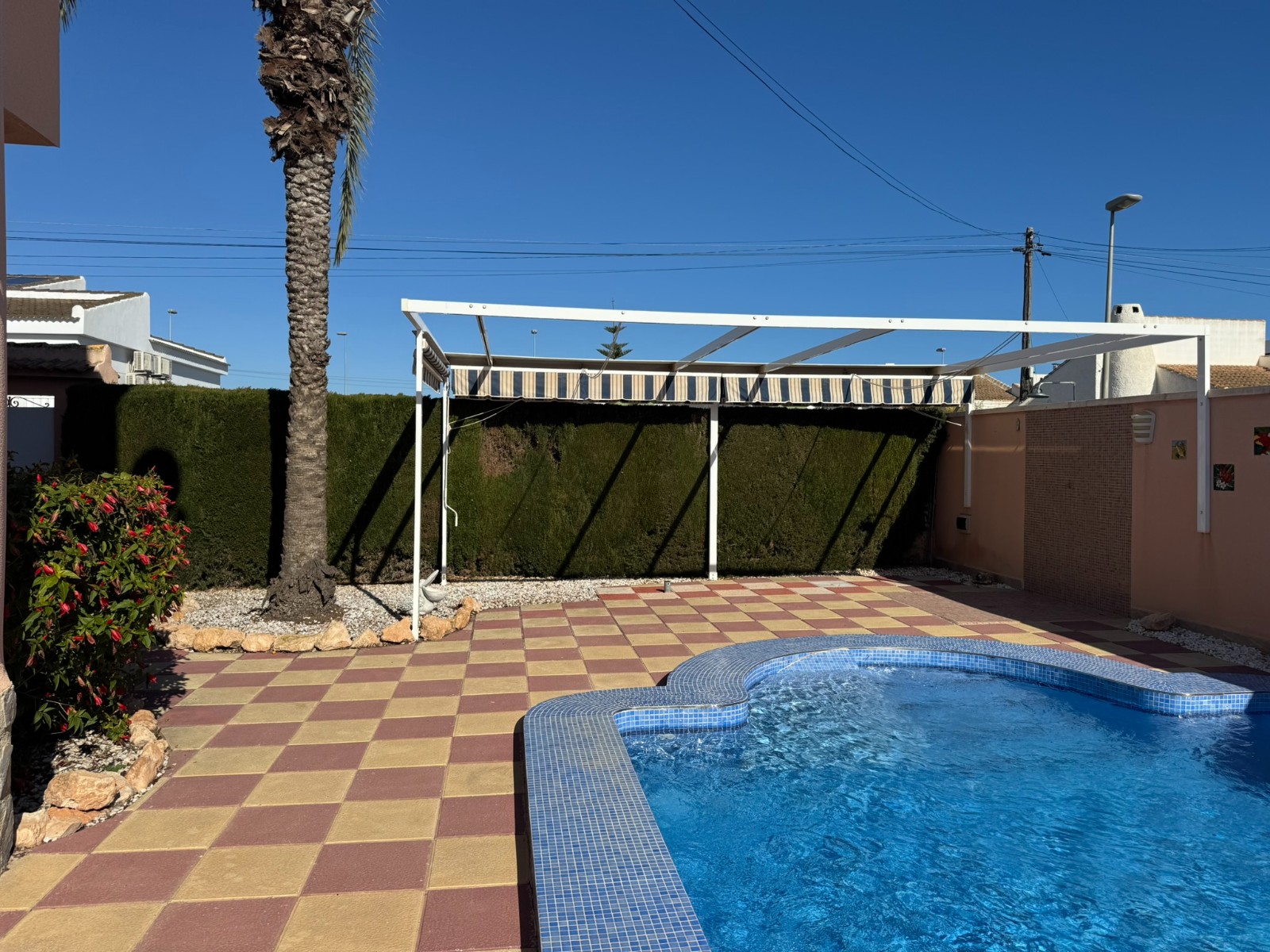 A unique villa located in a very quiet street in Las Mil Palmeras. This villa has a large plot with a 8x4 swimming pool whihch is heated and a large villa that has been converted into 2 separate living areas. The ground floor has 2 bedrooms, 1 bathroom and an american style kitchen & the top floor is a self contained 1 bedroom apartment with its own kitchen, lounge and bathroom. The lounge has access to a large balcony. The property could be converted with internal steps to make one large villa or you could keep the layout for possible rentals. Mil Palmeras is a beautiful beach side urbanisation with lots of bars, restaurants, supermarkets, doctors, pharmacy and some of the best beaches in the South Costa Blanca. Once you are here you do not need a vehicle as everything is within walking distance.